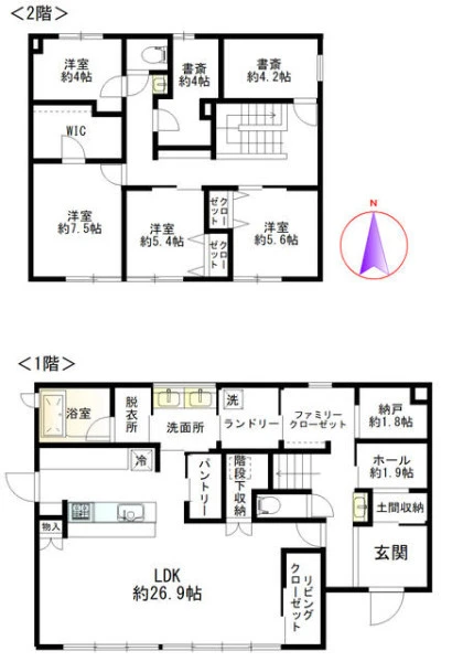 | 設備 | 都市ガス、電気、上水道、下水道、システムキッチン、カウンターキッチン、浄水器、食器洗浄乾燥機、追焚機能、トイレ2箇所、温水洗浄便座、浴室乾燥機、エアコン、床暖房、複層ガラス、庭、インターネット、ウォークインクローゼット、シューズインクローゼット、駐車2台可、ディンプルキー、モニタ付インターホン、火災警報器等設置済 | ||