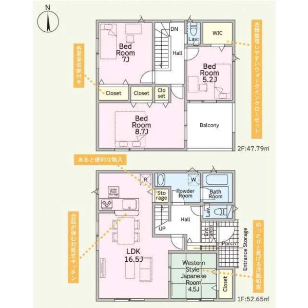 | 設備 | プロパンガス、電気、上水道、浄化槽、システムキッチン、カウンターキッチン、浄水器、給湯、トイレ2箇所、温水洗浄便座、シャンプードレッサー、浴室乾燥機、フローリング、複層ガラス、ルーフバルコニー、収納スペース、ウォークインクローゼット、床下収納、駐車2台可、ディンプルキー、モニタ付インターホン、火災警報器等設置済、建設住宅性能評価取得(予定含む) | ||