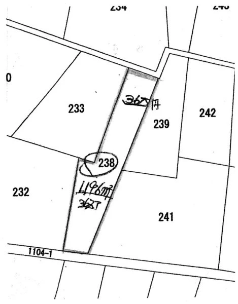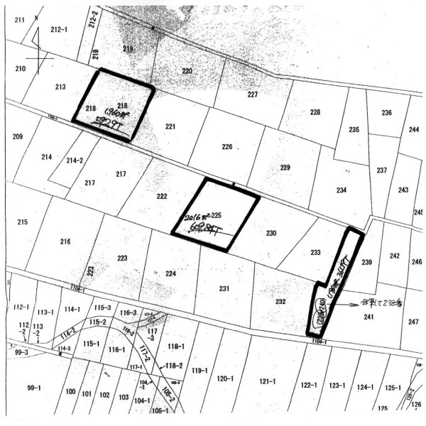 | 諸条件・相談 | 218番(1960㎡)、225番(2016㎡)、238番(1196㎡)の3筆合計でも、各筆ごとの売買でも可能 それぞれ単独売買の場合、218番は59万円、225番は60万円、238番は36万円 | ||