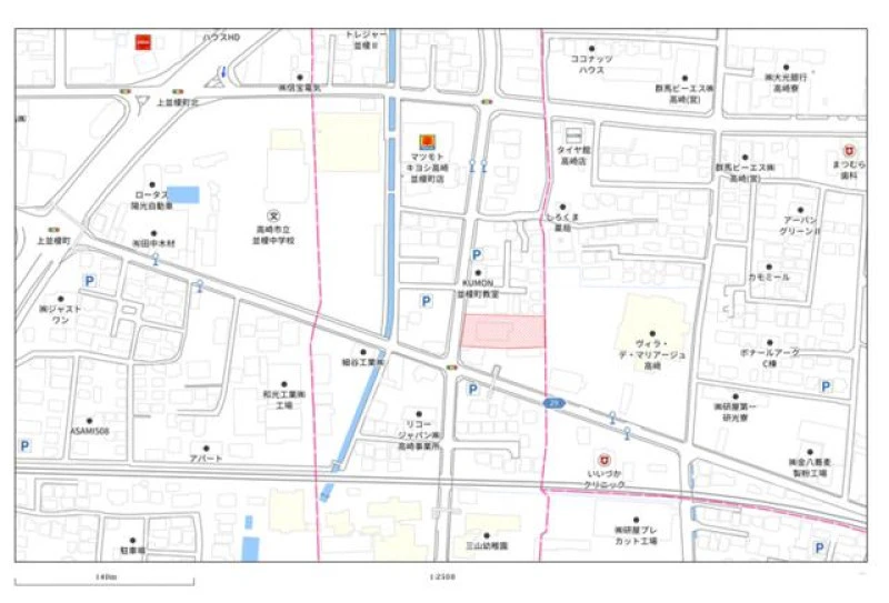 ※地図上の「対象地」は「群馬県高崎市並榎町 」付近を示しています。実際の場所ではない場合がございます。詳しくはお問い合わせください。