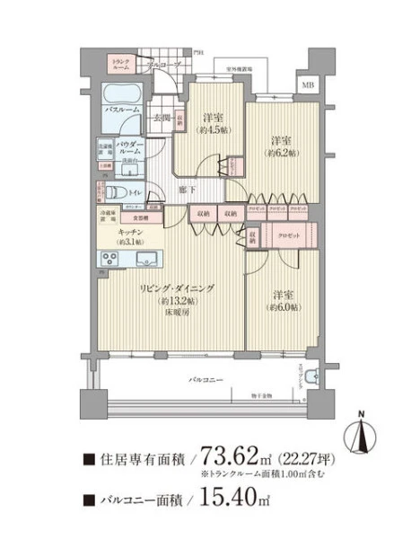 | 専有面積 | 73.62㎡(壁芯) | 建物構造 | 鉄筋コンクリート(RC) |