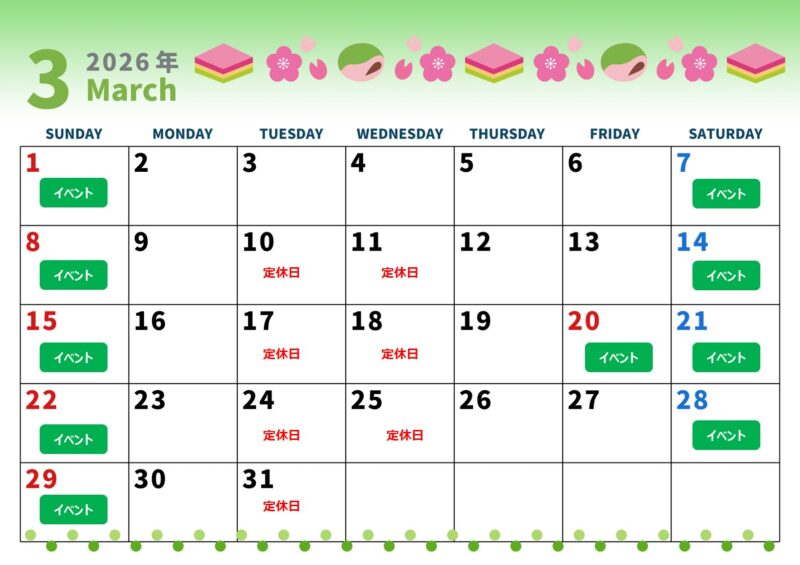土曜日・日曜日・祝日(火・水を除く)はイベントを開催しております。